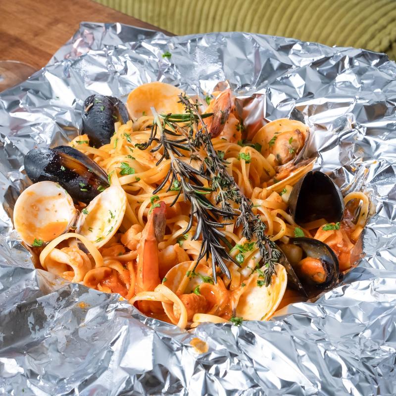 Mixed seafood and linguine wrapped in foil and baked